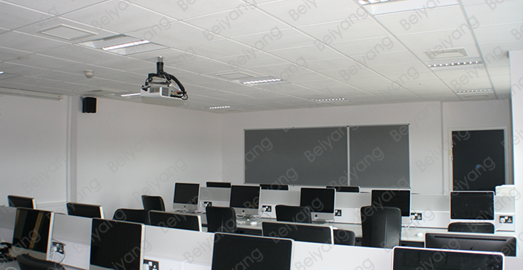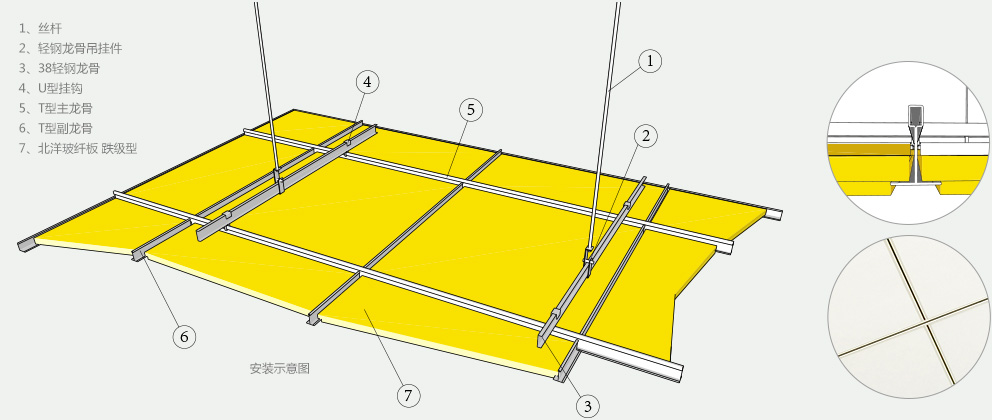采用明架龍骨安裝,安裝后板面低于龍骨。拆卸方便。